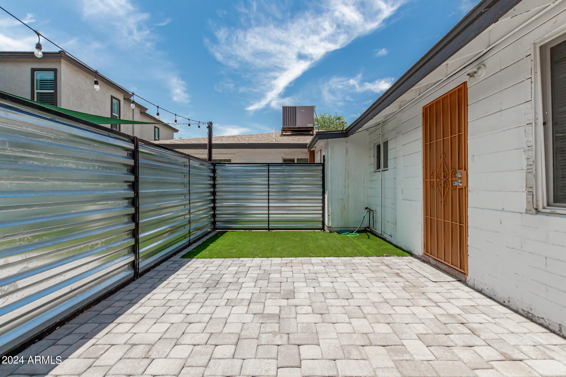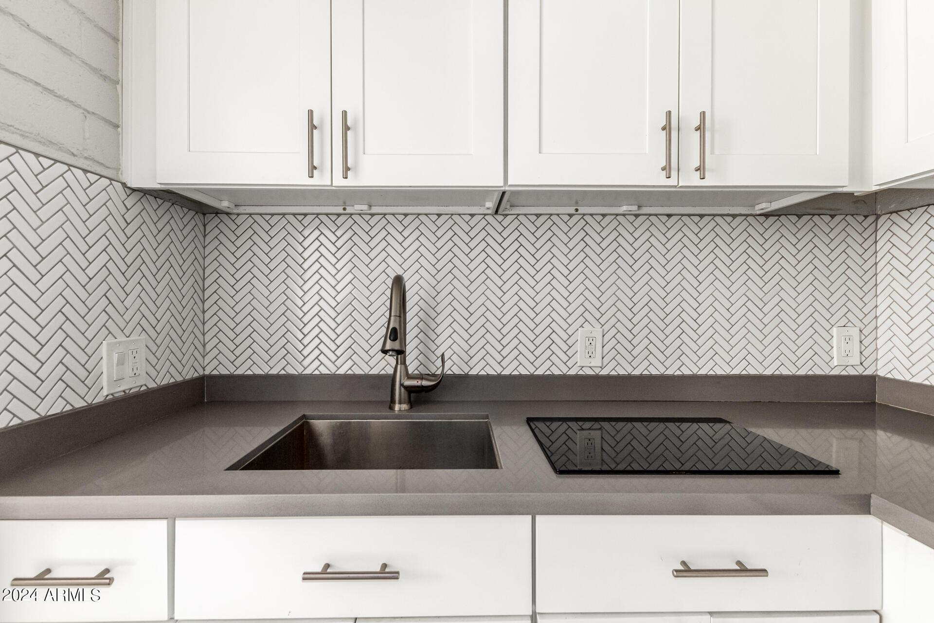 Low-maintenance efficiency unit with a spacious fenced backyard, pavers, and artificial grass. Interior features gray plank tile throughout, an open living space, and a tiled walk-in shower. Kitchen includes quartz countertop, tile backsplash, white cabinets with handles, electric cooktop, and refrigerator. Available for touring.